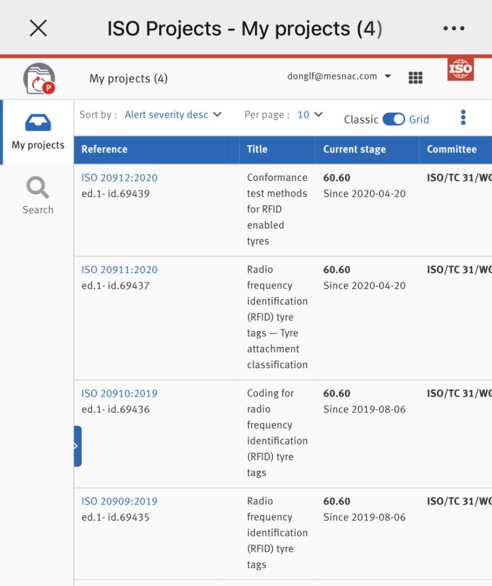 轮胎用RFID电子标签四项国际标准于2015年10月正式立项,由国际标准化组织ISO/TC31(轮胎、轮辋和气门嘴国际标准化技术委员会)下设的WG10“RFID tyre tags”工作组负责制定;工作组由来自中国、法国、意大利、美国、英国、德国、日本、韩国、芬兰、加拿大、比利时、泰国、荷兰、奥地利、阿拉伯联合酋长国等国家相关企业单位的60余名专家组成。2015年10月至今,WG10工作组先后在布鲁塞尔、三亚、马赛、西雅图、罗马、东京、格林维尔、青岛等地方召开8次全球工作会议,若干次工作组网络会议,讨论标准内容,解决各方分歧,四项国际标准分别并先后在全球范围内完成CD(委员会阶段)投票,DIS(国际标准草案)投票,FDIS(最终国际标准草案)投票,最终形成统一意见。继2019年8月份,ISO 20909:2019 Radio frequency identification (RFID) tyre tags,ISO 20910:2019 Coding for radio frequency identification (RFID) tyre tags两项国际标准发布后,ISO 20911:2020 Radio frequency identification (RFID) tyre tags-Tyre attachment classification, ISO 20912:2020 Conformance test methods for RFID enabled tyres两项标准于2020年4月20日发布。目前,ISO/TC31/WG10工作组承担的轮胎用RFID电子标签四项国际标准已经全部发布。