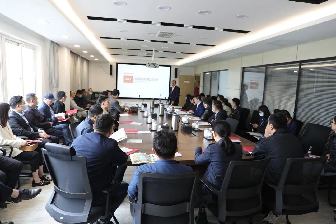 副总经理王建军为来访客人介绍了软控的发展历程和企业文化,以及近年来公司在橡机智造、战略新兴、新材料领域的应用、全球化布局等方面取得的成果。