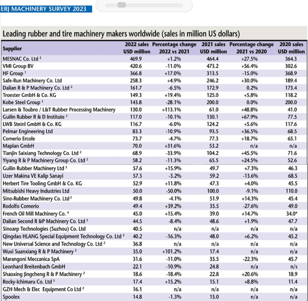 在最新出版的欧洲橡胶杂志(European Rubber Journal) 5/6月刊,公布了2022年全球橡胶机械行业企业的销售收入排名,软控(MESNAC)位居第一。